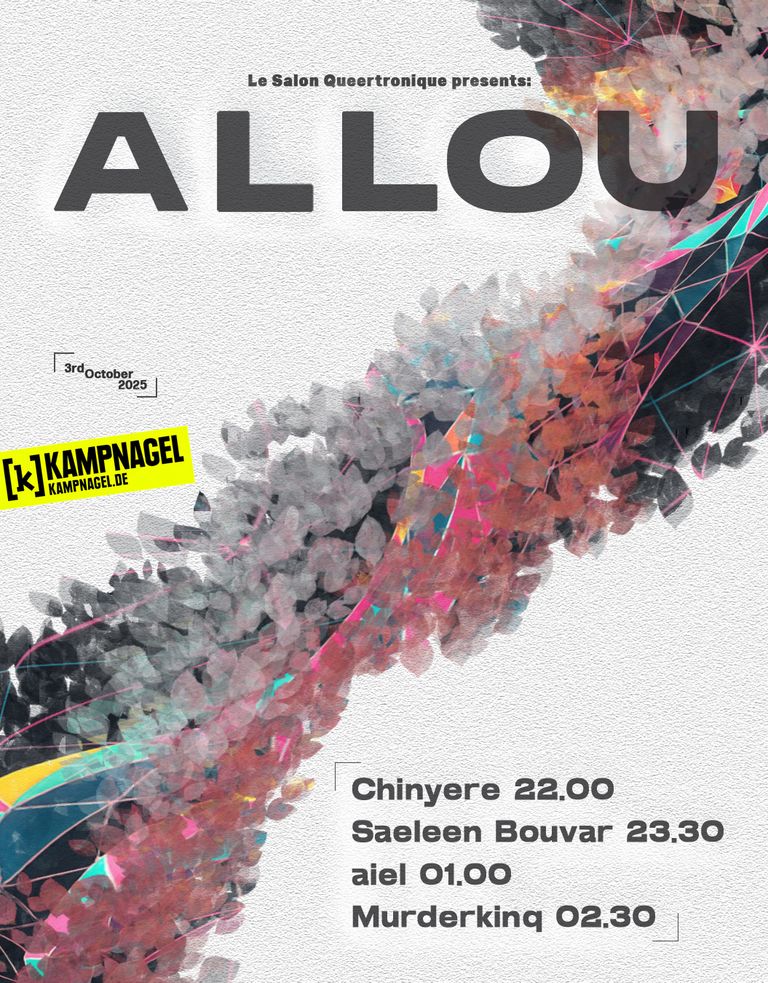 ALLOU, aus dem Griechischen für »anderswo«, trägt dieses Erbe auf den Hamburger Dancefloor. Es ist die Entstehung einer neuen trans Sonic Experience: beatlastig, polyrhythmisch, wild und ungebändigt. Chinyere formt den Raum durch Sound und verwandelt den Dancefloor in ein Experiment der Bewegung. Aiel, bekannt für ihre visionären Ambient-Arbeiten, wendet sich mit einem seltenen und kompromisslosen Club-Set dem Rhythmus zu, ein Beweis, dass ihre kuratorische Präzision ebenso im Beat wie in der Atmosphäre lebt.